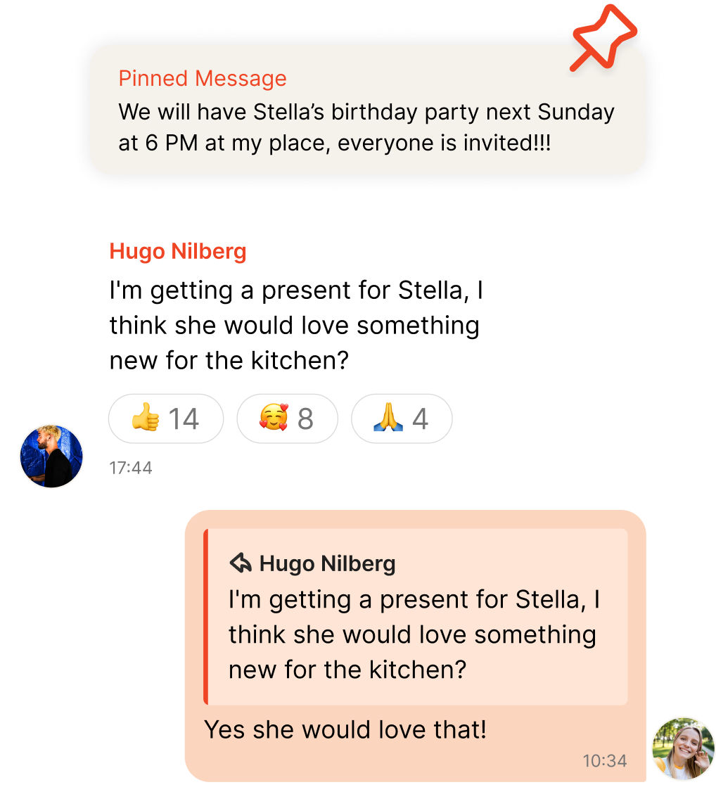 Keep your group in sync with pinned messages, replies, and quick emoji reactions. Share photos, files, and updates - everything’s easy to find when you need it.