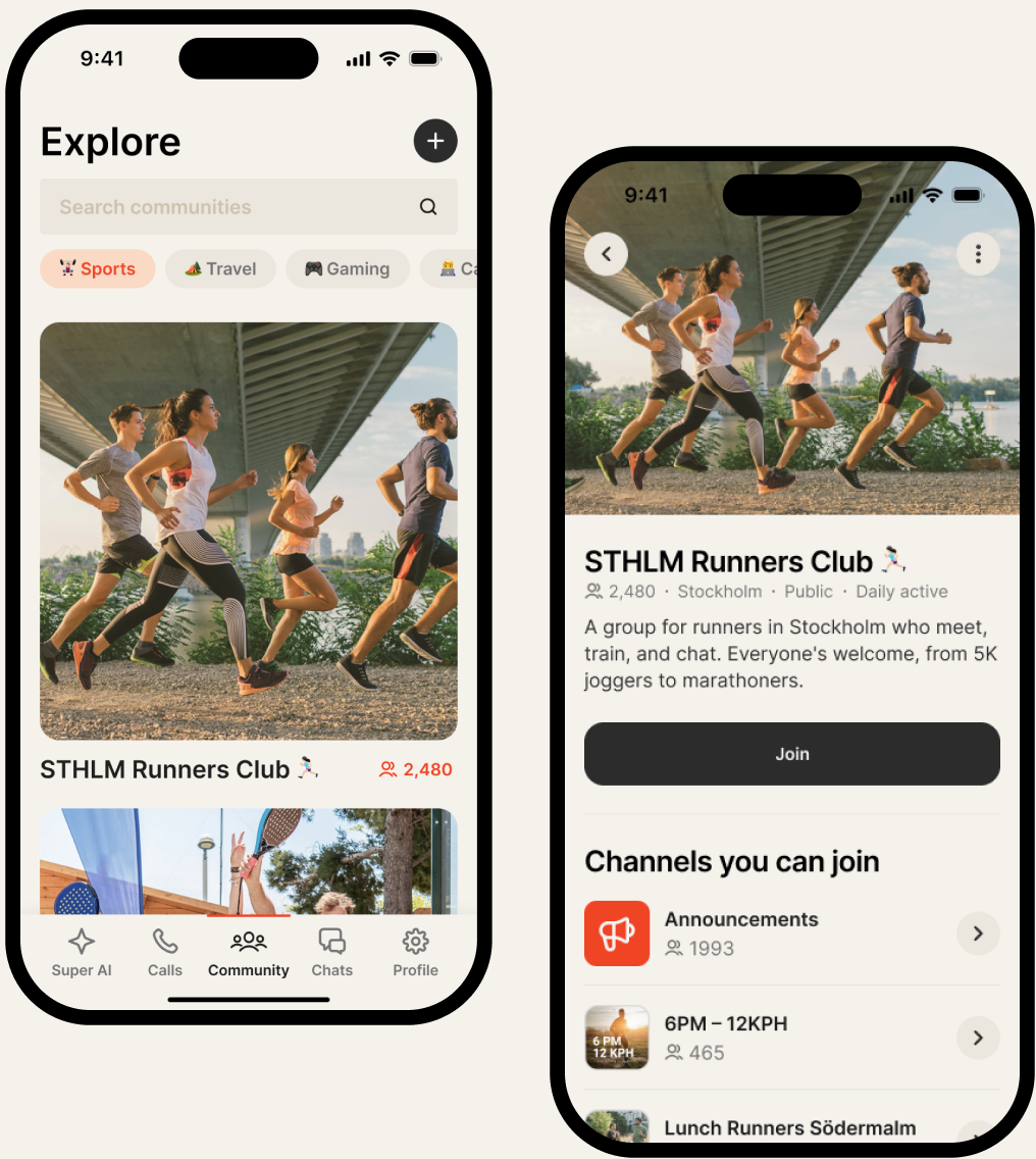 Bring your group together with structured communication tools. Assign co-admins, post announcements, and create channels to keep everyone connected. Or join existing communities that match your interests.
