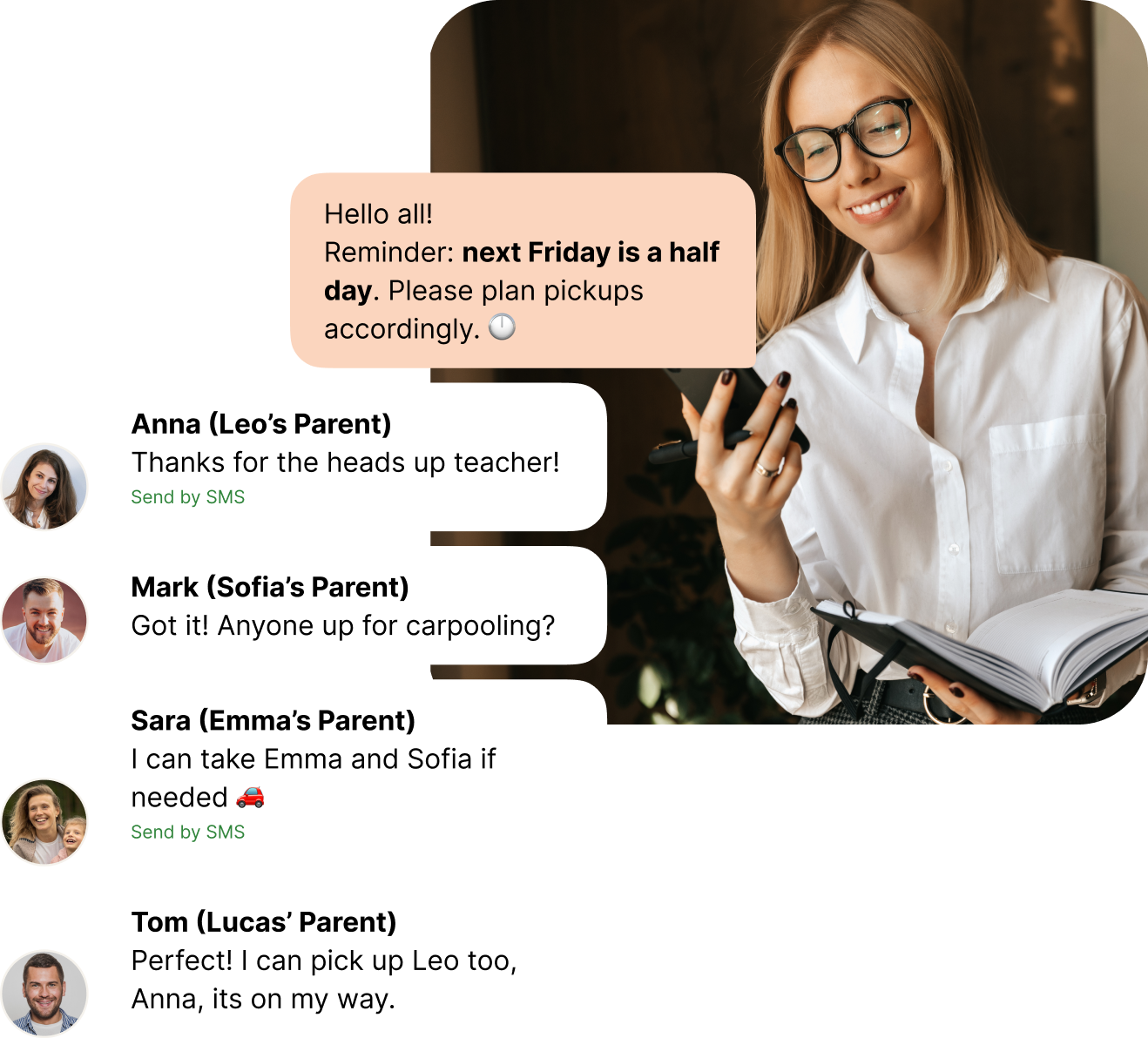 Stay connected with your community, from school updates and carpool plans to sports events and neighborhood alerts. Supertext keeps every parent, neighbor, and organizer in the loop, even those without the app.