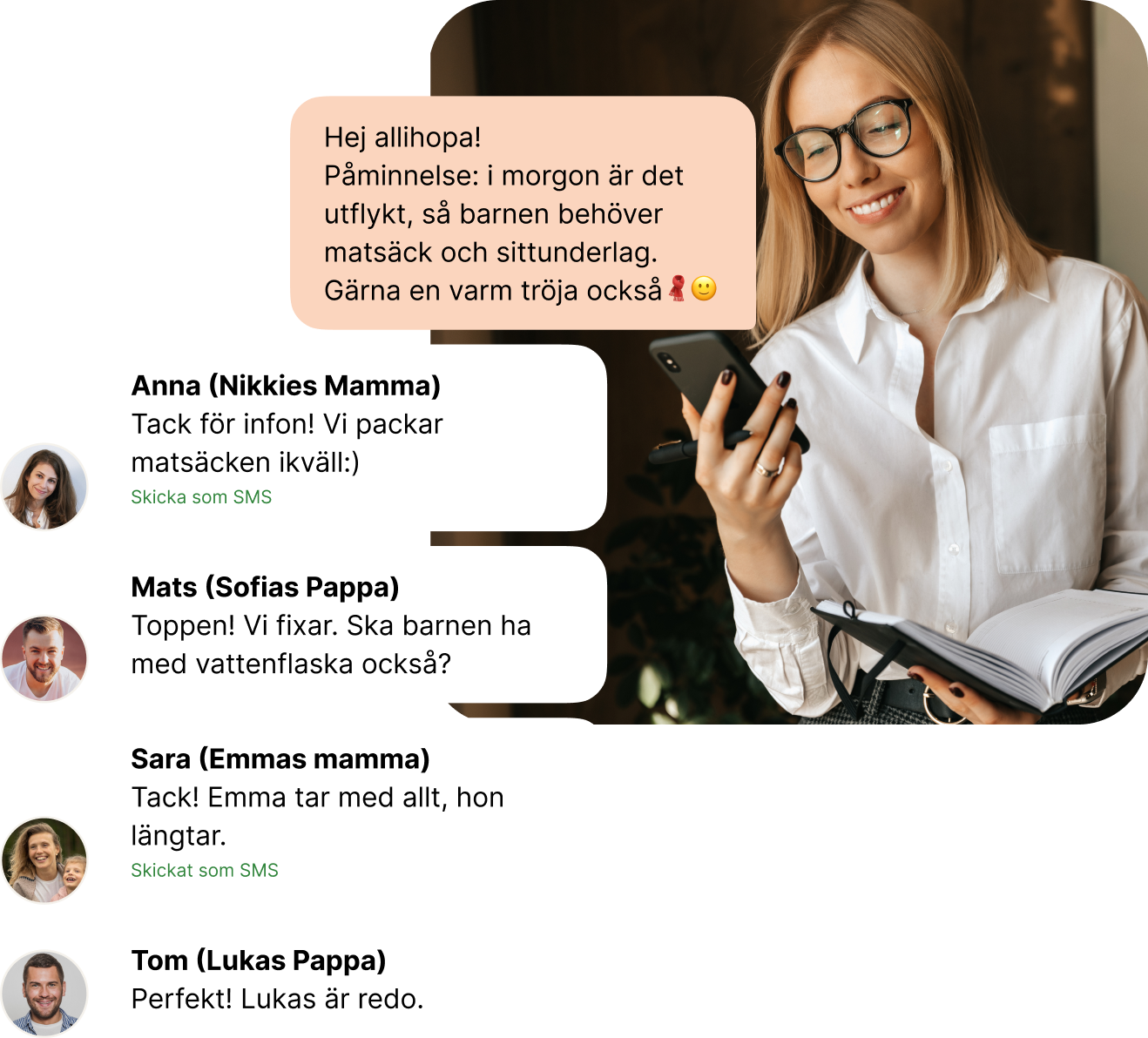 Skolinfo, samåkning, matcher eller grannsamverkan – Supertext gör det enkelt att hålla ihop vardagens alla grupper. Alla föräldrar, grannar och organisatörer nås, även de som inte har appen.