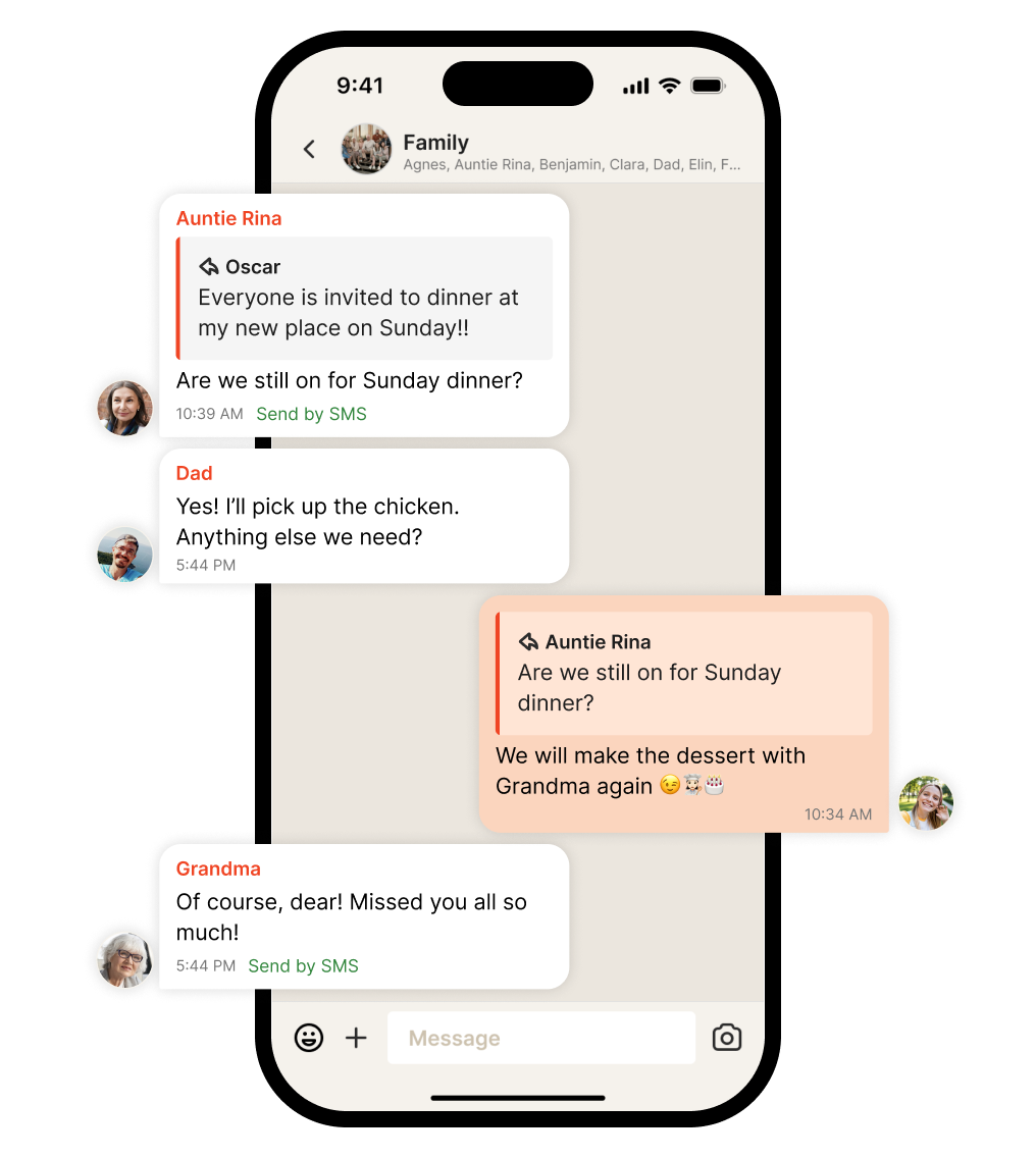- Family chat – everyone included, no matter phone or tech skills.